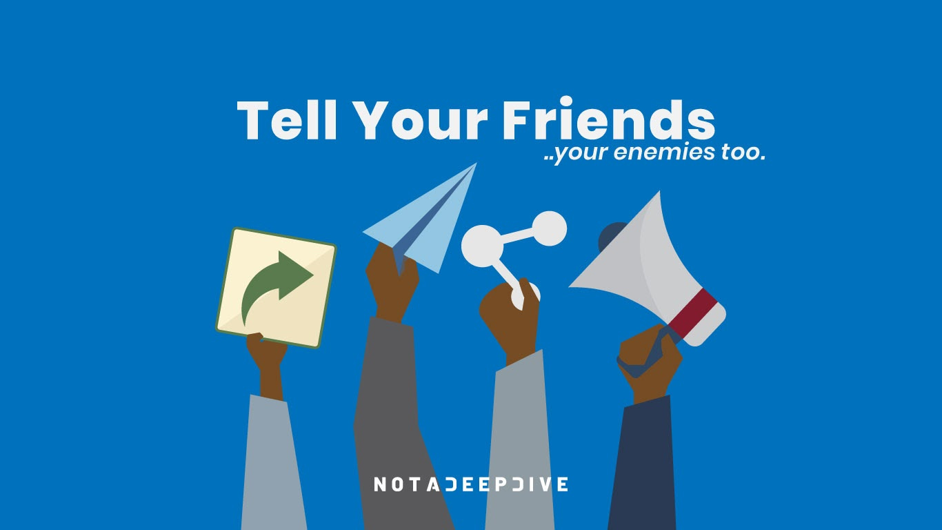Friends always tell friends about Notadeepdive, so click that share button to share Notadeepdive with your network. The more, the merrier, so invite everyone you know, and you’ll earn rewards for being so selfless.