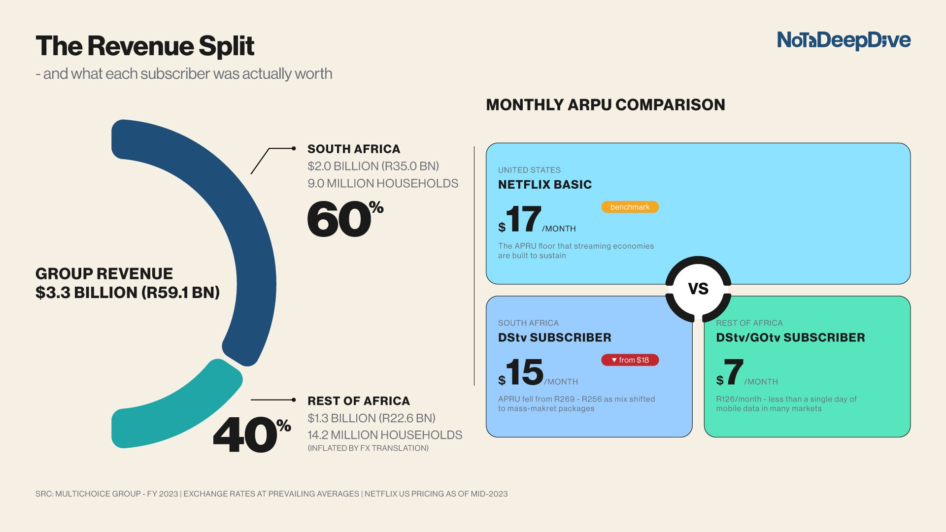 In March 2025, MultiChoice lost 2.8 million linear subscribers. Nigeria, which once drove 44% of Rest of Africa revenue, was hit with FX volatility and inflation. MultiChoice’s Rest of Africa revenues fell 44% in dollar terms with a trading loss of R760 million on a reported basis. The segment that had finally turned profitable in FY23 was back in the red within two years.
